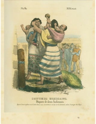 Esta vez no se comparan dos litografías por ser de la misma temática en cuanto a profesión como en los casos anteriores, sino por el hecho de como se retrataba a la mujer mexicana en ese tiempo. La diferencia más obvia es que en el libro de Linati se muestra una disputa o pelea entre dos mujeres relativamente mayores en plena vía publica cargando cada una un bebe, mientras son observadas por otros habitantes del pueblo. Esto claramente da una mala imagen a las mujeres y a nuestro país en general, pues las pinta como temperamentales y violentas, poniendo en riesgo hasta a un par de bebes. Mientras tanto la estanquillera muestra una mujer calmada y tranquila vendiendo sus cosas, con un traje típico y un porte elegante. Actualmente sigue la constante lucha de genero por mayor igualdad y respeto entre hombres y mujeres.